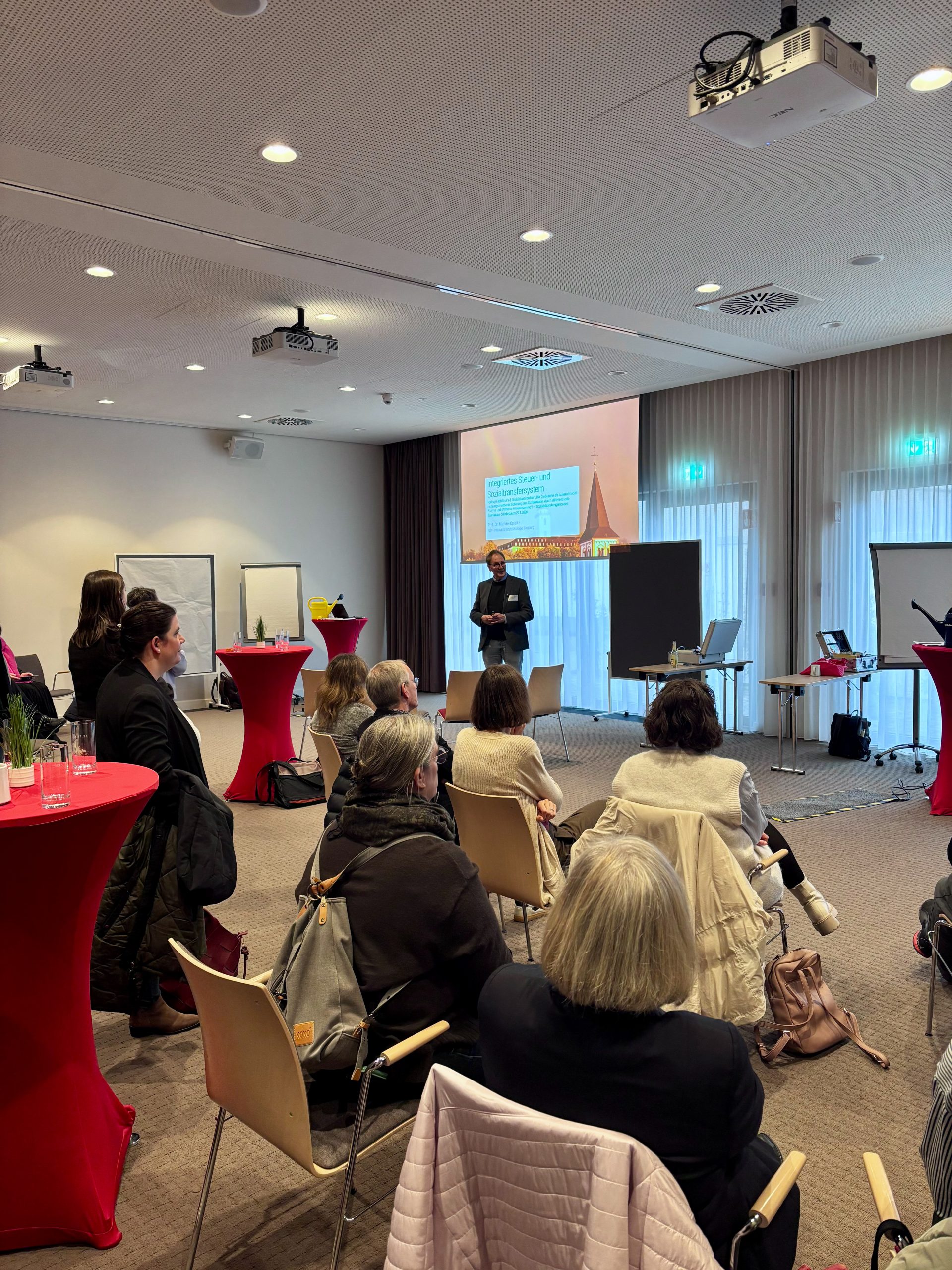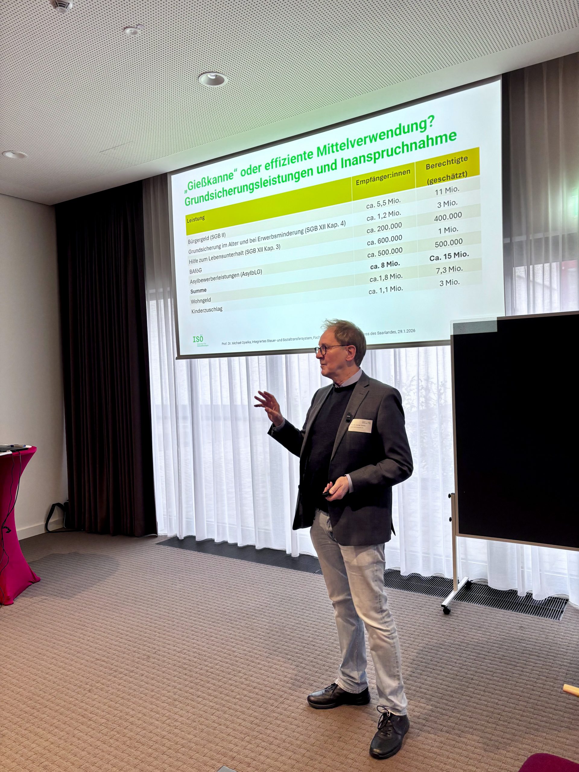 Auf dem Sozialstaatskongress des Saarlandes „Sozialstaat im Wandel – Herausforderungen und Lösungen für die Zukunft“ in Saarbrücken. veranstaltet vom Ministerium für Arbeit, Soziales, Frauen und Gesundheit, die Arbeitskammer des Saarlandes und die Arbeiterwohlfahrt Saarland e.V., hielt Prof. Dr. Michael Opielka am 29. Januar 2026 im Fachforum 4 Sozialstaat konkret „Die Gießkanne als Auslaufmodell – Lösungsorientierte Sicherung des Sozialstaates durch differenzierte Analyse und effiziente Mittelsteuerung“) einen Vortrag zum Thema „Integriertes Steuer- und Sozialtransfersystem“.
